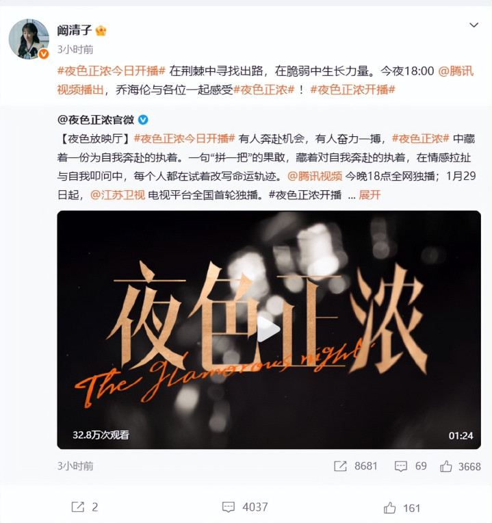 这部《夜色正浓》刚宣布要开播,热度就相当的高,而阚女士的心情也是相当的不错,