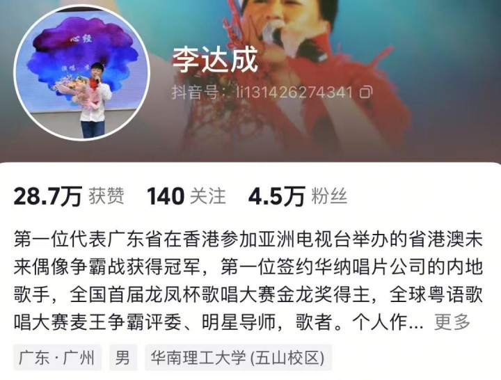 除了这些之外李达成在抖音平台还开通了自己的个人账号,时不时的也会在上面发一些自己唱歌的视频。