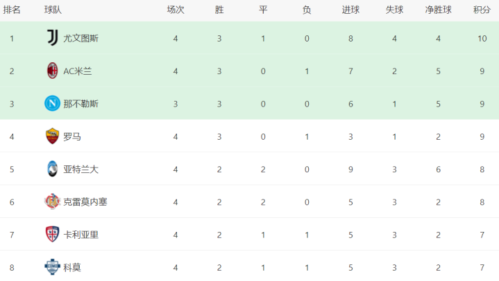 在积分榜上,尤文图斯3胜1平拿到10分排名榜首。AC米兰以9分排名第2。那不勒斯和罗马也都是9分,排名第3和第4名。不过,那不勒斯少踢1场,3场全胜。亚特兰大和克雷莫内塞都是8个积分。国际米兰2胜2负,只拿到6分,排名第10。拉齐奥只拿到3分,排名第13。