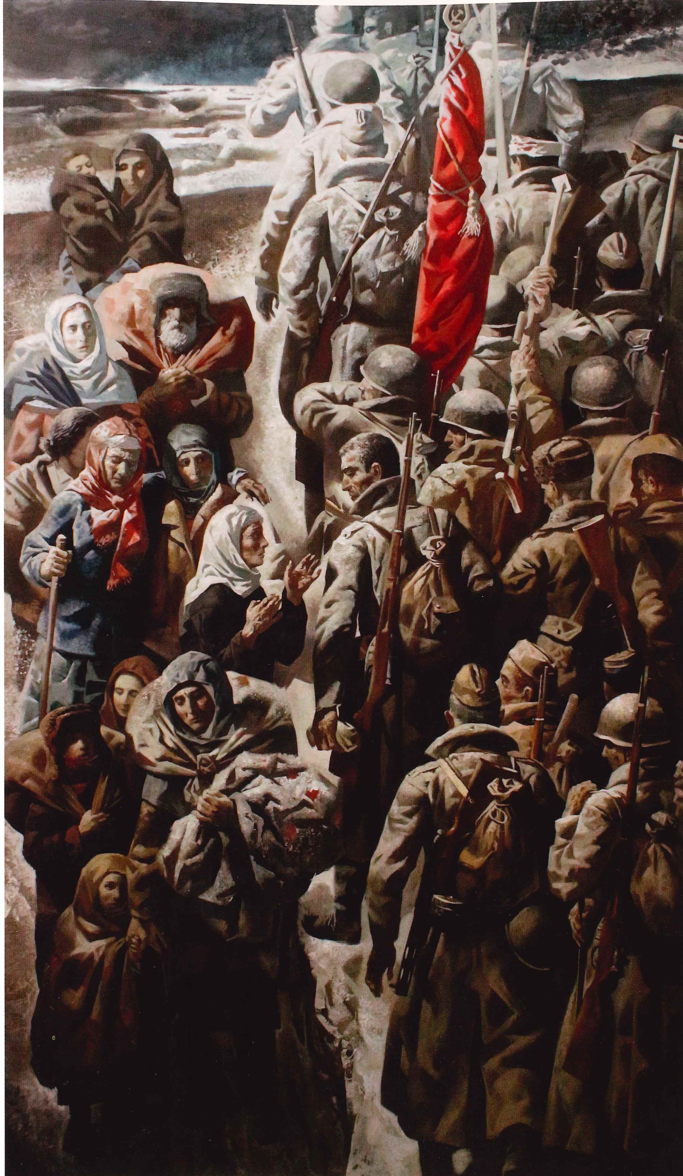 《战争路上》由俄罗斯艺术家瓦基姆・卡特扎耶夫于2014年创作,作品以一种近乎平行的构图,描绘了战争中的士兵与民众前行相互汇聚的场景。