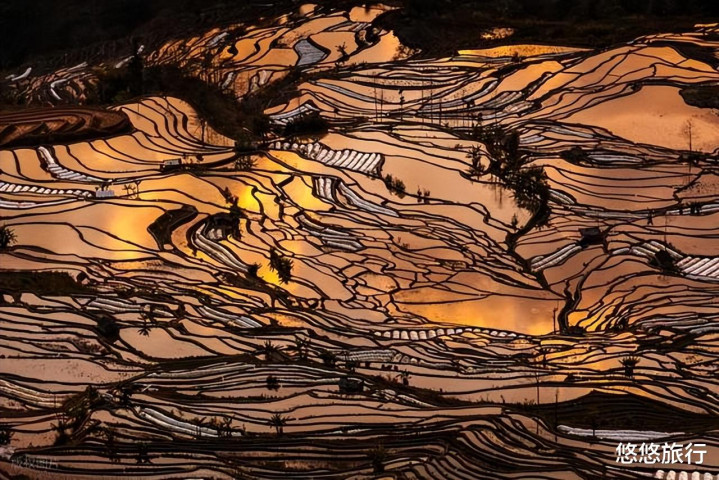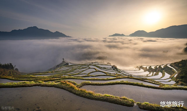 灌水期的元阳梯田是光与影的美,3000 多级田埂像碎镜闪着光。多依树看日出云海,坝达追日落,夕阳把梯田染成金红色。原生态哈尼村落-阿者科,蘑菇房很有特色。