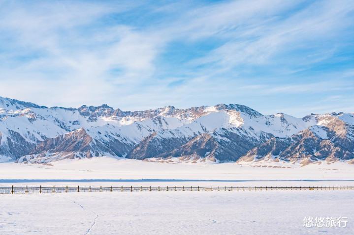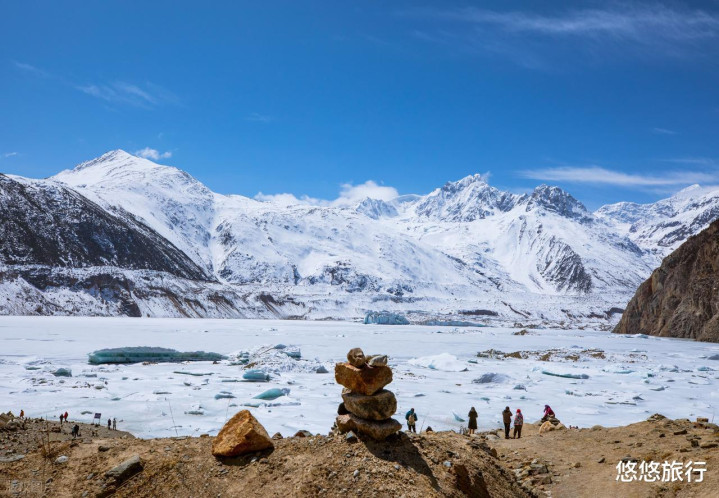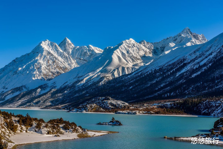 然乌湖结了冰的湖面映着雪山,像遗落人间的仙湖。
