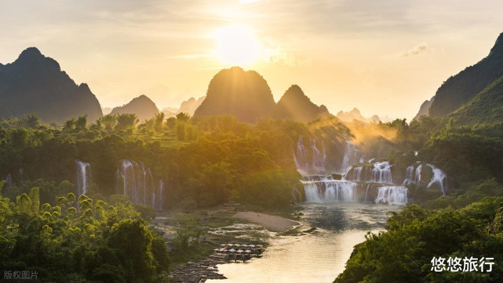 德天瀑布的三级阶梯从山顶倾泻而下,水雾里时不时冒出彩虹。乘竹筏靠近,凉丝丝的水汽扑在脸上。不远处的稻田咖啡,视角直面瀑布群。