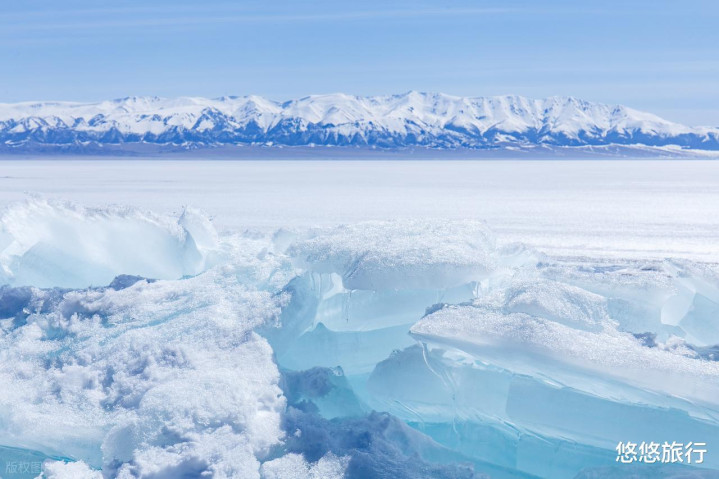 12月中-1月初,湖面初冻呈现冰推奇观。1月-2月,湖面蓝冰巅峰期,通透如琉璃,岸边堆积晶莹冰块。